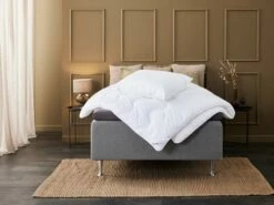 | Fyllning | 100% polyester, fiberdunFiberdun är polyesterfibrer som varken absorberar fukt från kroppen eller kvalster och därför ger det en sund sovmiljö. I motsatts till andra polyesterfibrer blåses fiberdunen in i överdraget på samma sätt som naturfyllning. |