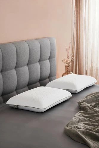 Allergivänlig, exklusiv kudde i tryckavlastande AIR memoryskum med ventilationshål och med fuktabsorberande bambukol. Ventilationshålen förbättrar luftflödet i kudden, vilket hjälper till att reglera temperaturen. AIR memoryskum formar sig snabbt efter nacken och axlarna, även i en kylig sovmiljö. Överdrag i 100% polyester, tvättbart i 40°C. Överdraget har fått en antikvalsterbehandling, vilket hjälper till att minska antalet dammkvalster. 40x60x13 cm