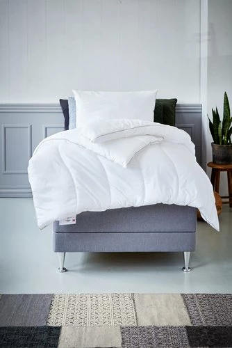 Kvalitetsset med fibertäcke och kudde. Luftig, isolerande fyllning av silikoniserad, spiralformad hålfiber, 1000/450 g. Överdrag i 65% polyester/35% bomull. Tvätt 60°C. Inkl. förvaringsväska. Täcke 150×210 cm. Kudde 50×60 cm
